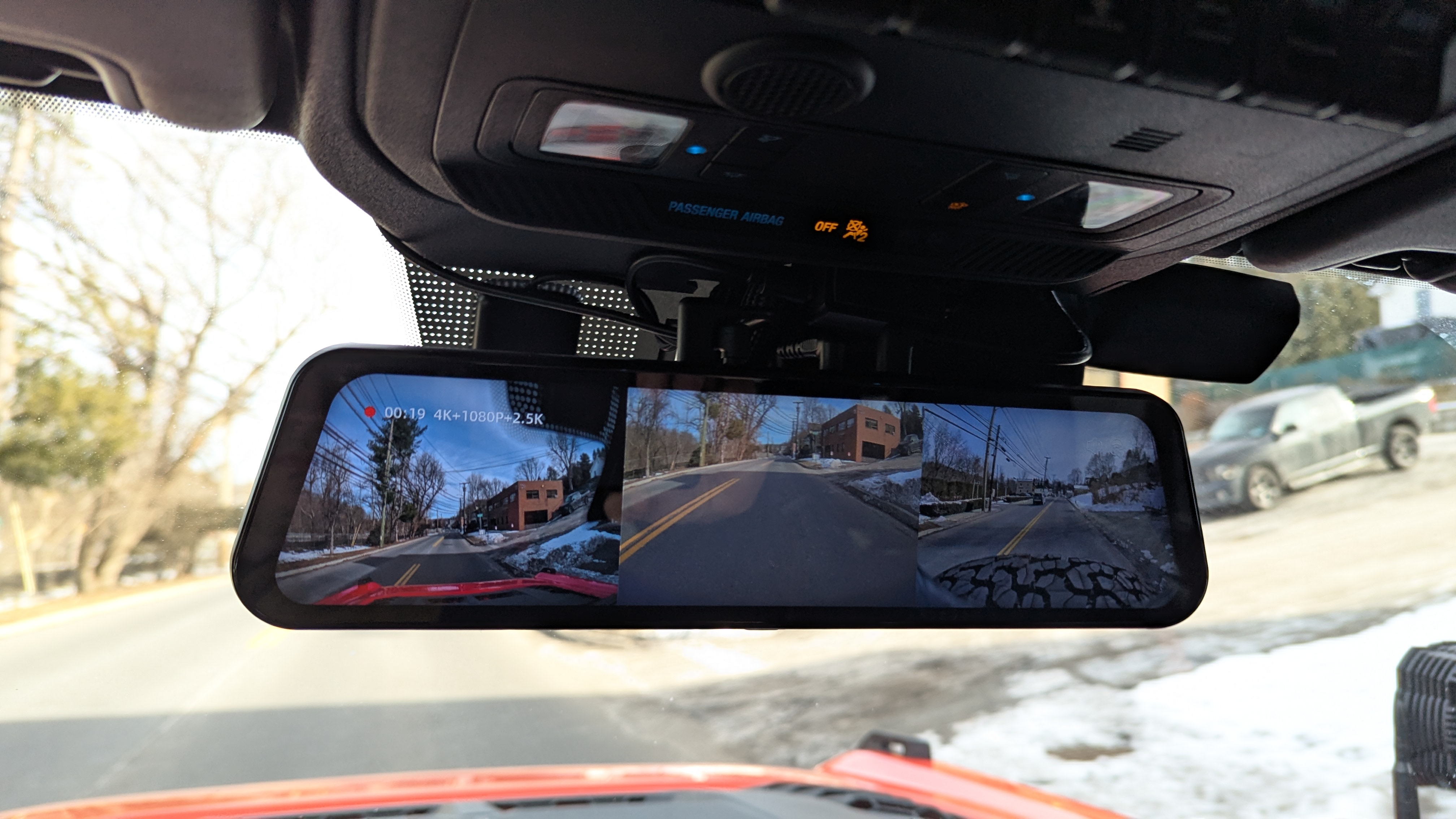 - Key Specs: I probably could’ve just done fine with the Wolfbox G900 Pro 2-Channel system, but the G900 TriPro had the added bonus camera for the front or anywhere else you’d think of putting it for an off-road camera. (There’s also an interior/cabin camera version) 4k Front facing “Dash Cam” built into the rearview mirror, 2.5k rear facing camera for the rearview mirror feed and the extra 1080p camera for the front facing or wherever you choose to mount it. 12” touchscreen mirror and a GPS antenna.
