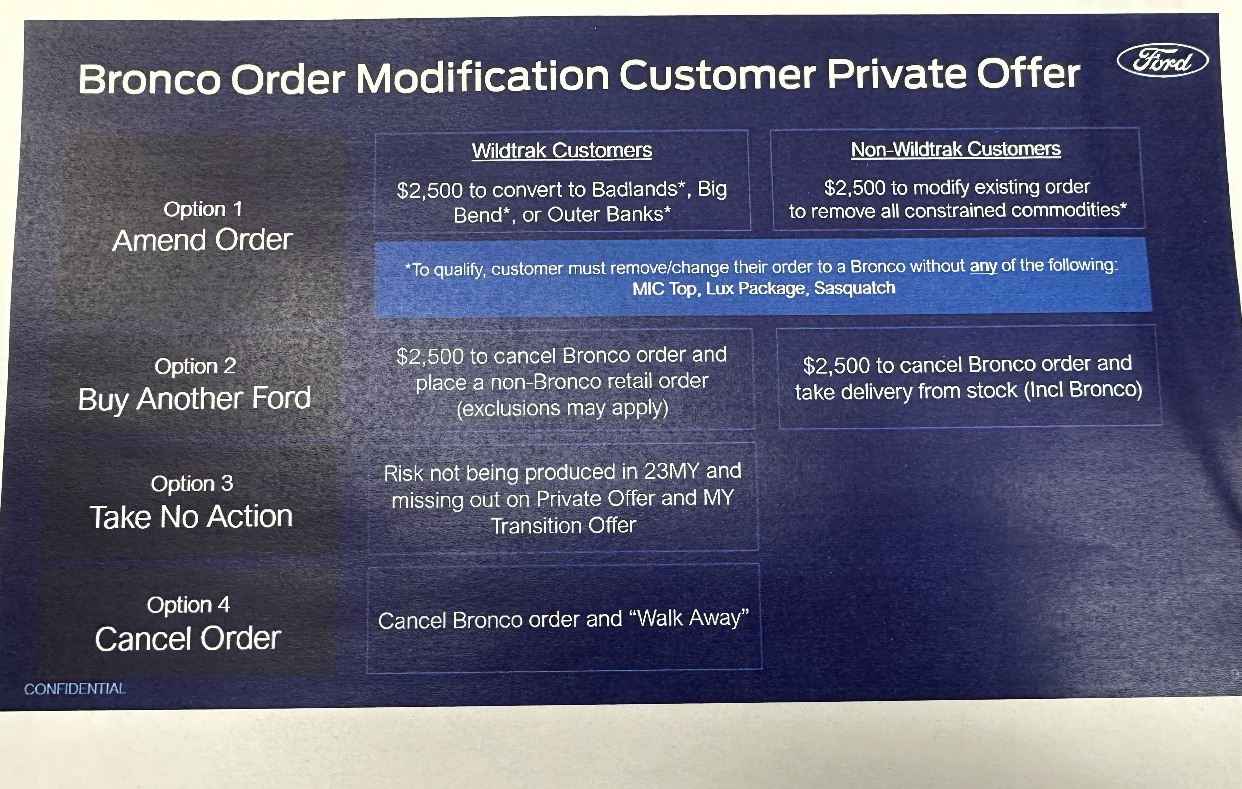 Hope all is well! Unfortunately, Ford has made us aware that customers with orders that have hardtops/LUX pkg/Sasquatch pkg will need to modify their order to drop these items for scheduling consideration.